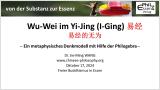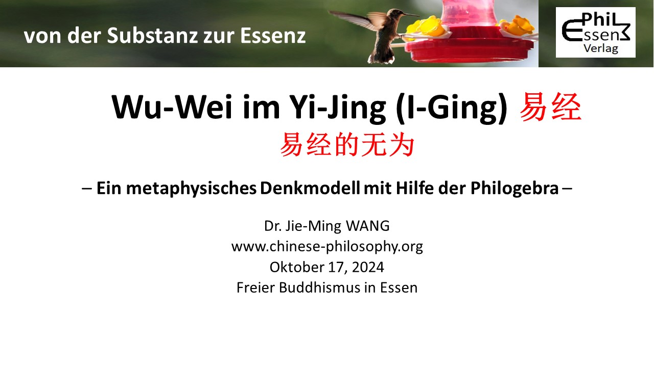 Der Vortrag gibt einen kurzen Überblick über die Wu-Wei-Aspekte im Yi-Jing, insbesondere über die Aspekte im täglichen Leben. Aufgrund der sehr komplexen philosophischen Anspielungen des Yi-Jing werden philogebraische Methoden angewendet, um die komplexen Zusammenhänge und Wechselwirkungen innerhalb eines Hexagramms und zwischen allen 64 Hexagrammen des Yi-Jing zu beschreiben. Auf diese Weise kann das Wu-Wei-Prinzip des Yi-Jing leichter seine Anwendung im täglichen Leben finden.